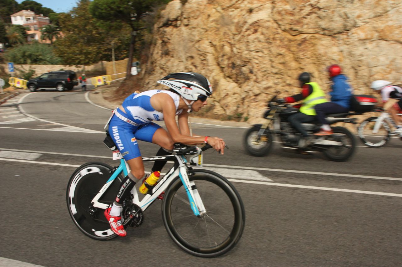 Bocinazo y 3800 metros por delante. Poco a poco fui cogiendo ritmo. La mar estaba muy tranquila y se nadaba bien. Más o menos en los tiempos esperados toqué tierra. 180 kilómetros estaban por delante. Comencé a un ritmo bastante tranquilo. El miedo y la incertidumbre estaban presentes. Miedo a pasarme y pagarlo en la maratón. En Malgrat, primer giro de 180º decido subir el ritmo. Voy concentrada (comiendo) y bebiendo. El sol sale de entre las nubes y el día es perfecto. Me quedo mosqueada porque no le he visto a Rober, pero igual se me había pasado. Cuando llego de nuevo a Calella me cantan tiempos, pero yo tengo otra cosa en mente, que es como va Rober. Me dicen o entiendo que el 15 y que Itsaso a 1′. Yo sigo a lo mío y van pasando los kilómetros. No le veo y me doy cuenta de la que va la 15 soy yo, han esquivado el tema. No sabía lo que le habría pasado pero algo seguro que sí. Tampoco le encontraba en el arcén. O se me había vuelto a pasar o le había pasado algo en el agua. Había muchos kilómetros para pensar. En la segunda vuelta veo a Rober y me dice lo del pinchazo. Casi me quedo hasta tranquila, pero me entra una tristeza… Me canta 4′ con Itsaso y 6′ con Ruth. Me concentro en la posición y en comer. Toca empezar a comer sólido, me había preparado un sandwich bien comprimido para que ocupara poco y fue una idea malísima. El primer mordisco tuve que escupir o me ahogaba. Pero había que coméserlo. En bici tenía que comer todo lo pensado, así que a bajar el ritmo, refrescarse la boca y a poquitos para dentro. Pasan los kilómetros y ya voy más cómoda acoplada que sin acoplarme. Último giro y 20 kilómetros para la transición.