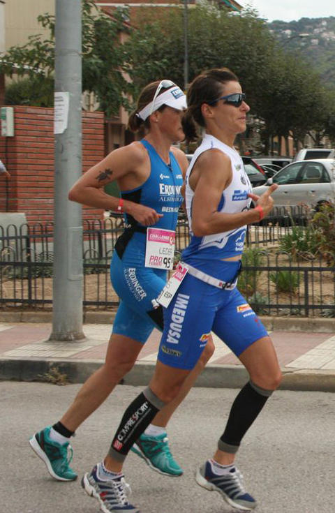T2, me calzo las zapatillas y a correr. Debido a las molestias de la rodilla había decidido correr con zapatillas mixtas, las K ona. Creo que fue una gran decisión. Comienzo a un ritmo «cómodo» y sin forzar mucho las piernas para no forzar la zona que me había dado problemas y muy concentrada. Noto como que tengo sueño, imagino que sería algo cervical después de bajar de la bici. Me vuelven a cantar tiempos y las diferencias van aumentando. Voy detrás de Nicole Leder. Me dice Rober que es buena corredora así que le tomo como referencia. Me acuerdo de los vídeos de Hawai que ponemos haciendo rodillo y que van corriendo codo con codo en plan McCormack y Alexander. jajaja lo que hace el cansancio. Pasan los kilómetros y ahora sí que empieza el Ironman. Los pensamientos dan vueltas en mi cabeza, uno el objetivo es  siempre ir guardando para llegar dignamente  y otro el mantener la posicion de lider que llevaba , cosas un poco contrarias. Empieza a doler todo. Intento mantener el ritmo, paso a Nicole y a 2 o 3 más. Kilómetro 21 y 9′ de diferencia.