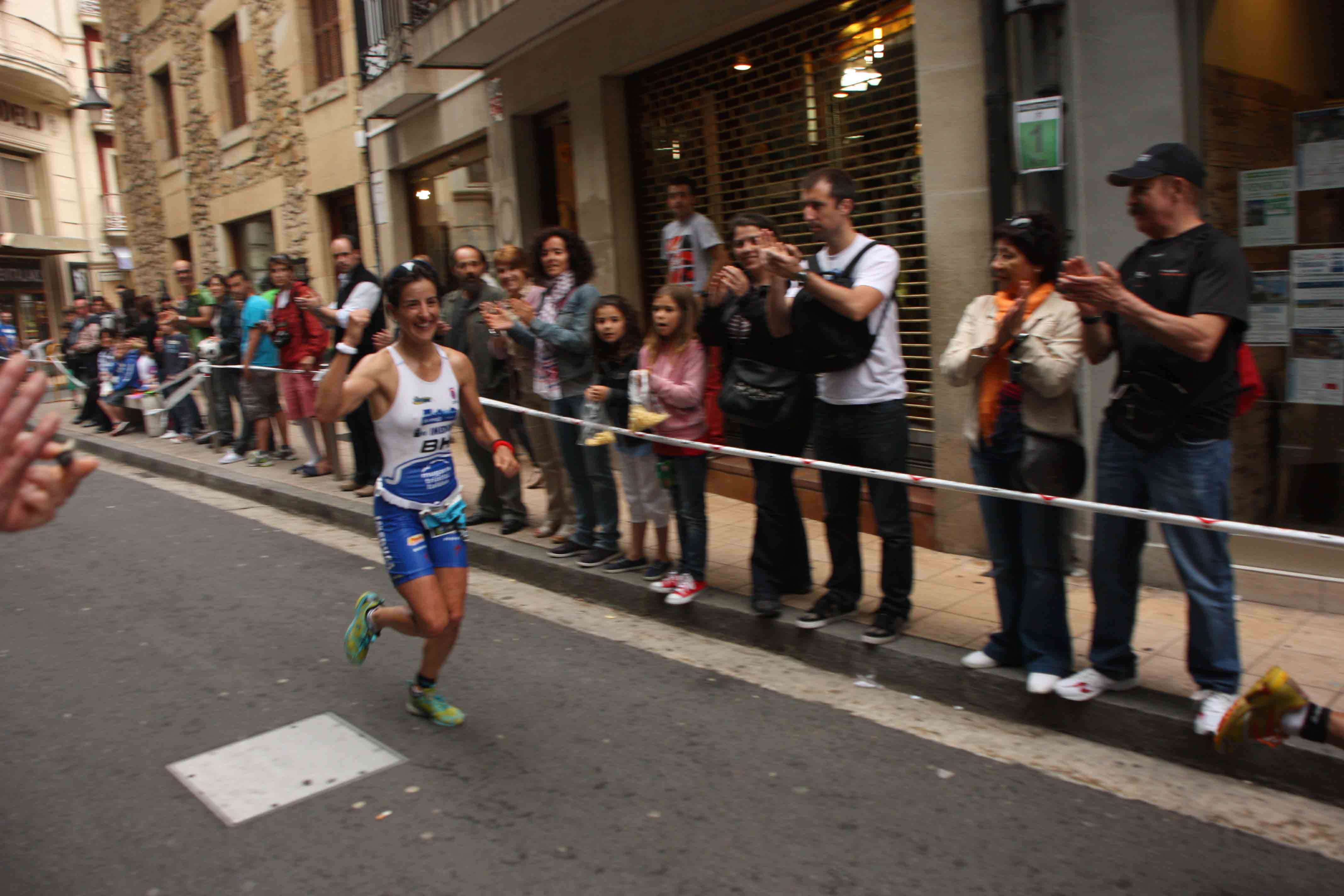 Las sensaciones eran buenas. Mi pensamiento antes de la carrera era que quería correr rápido. Había dejado preparadas mis K-Swiss K-Ruuz, las voladoras. Sólo hacía falta bajarse con ganas. Dejé la bici y me encontraba bien para correr fuerte desde el principio. Me cantaban tiempos con las rivales, pero me olvidé un poco y me centré en mi ritmo. Las rivales se fueron poniendo a tiro y fue la manera de mantener el ritmo. Resultaba emocionante que mis rivales españolas me animaban cuando nos cruzábamos. En el km15 me coloqué en 6ª posición y poco después pasé otras 2 que iban muy juntas. Me coloqué en 4ª posición.